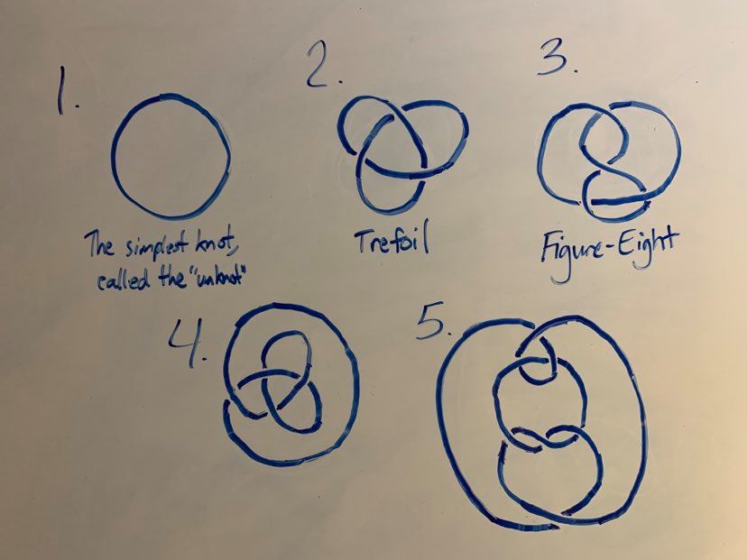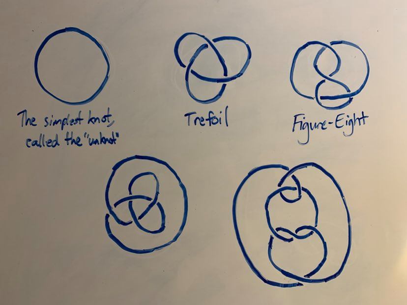 A knot is a closed loop in three dimensional space that doesn’t intersect itself. Some examples: