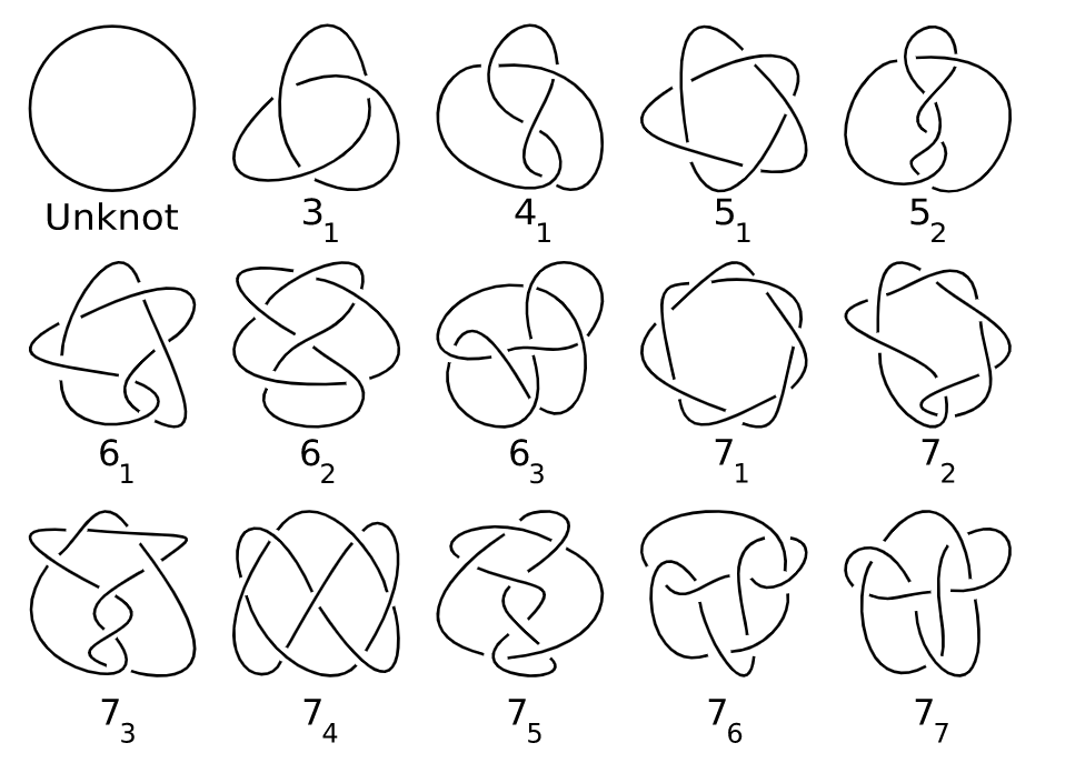 If nothing else, I hope I’ve convinced you that the subject of knots is of great mathematical interest and inspired you to look into it yourself. I’ll leave you with the first few rows of a (necessarily infinite) periodic table of knots, showing the prime knots up to seven crossings: