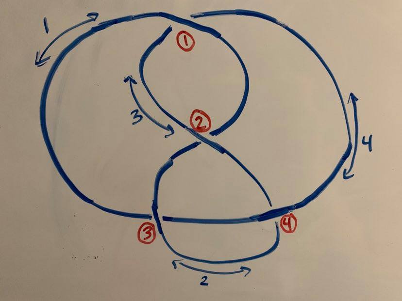 The “uncountable infinity” aspect of this second problem can actually be quickly resolved by sharpening our original question. Rather than regarding a knot diagram as any two-dimensional projection of a knot, we can think about a knot diagram as defined by its various crossings. For instance, we can label each uninterrupted “arc” in a knot diagram, as well as each crossing point.