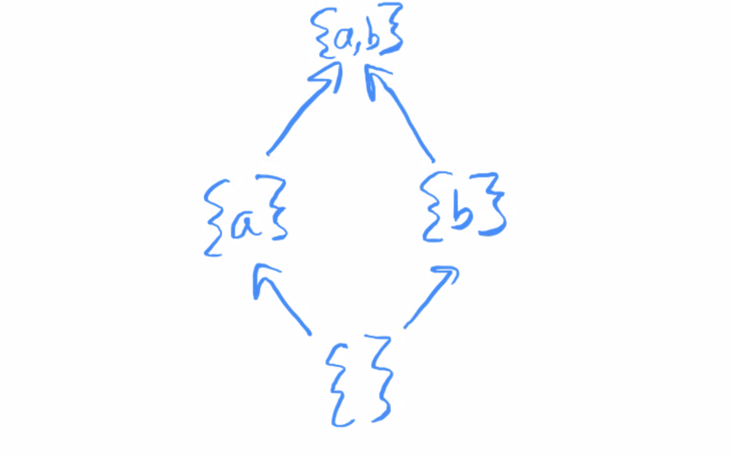There’s a nice way to visualize filters and ultrafilters that uses the Hasse diagram of the power set of X. For a concrete example, let X = {a, b}. We can draw the power-set of X as follows: