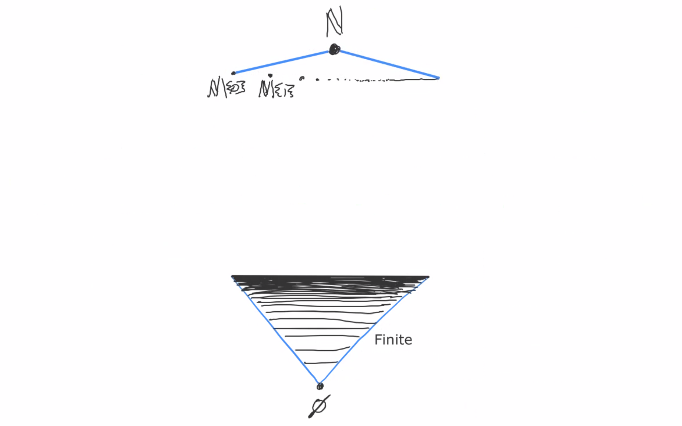 The Hasse diagram for an infinite set is a bit harder to visualize, since now we have uncountably many subsets. But let’s try anyway! What does the Hasse diagram of ℕ look like? Well, we know that ∅ is at the bottom and ℕ is at the top, so let’s start there.