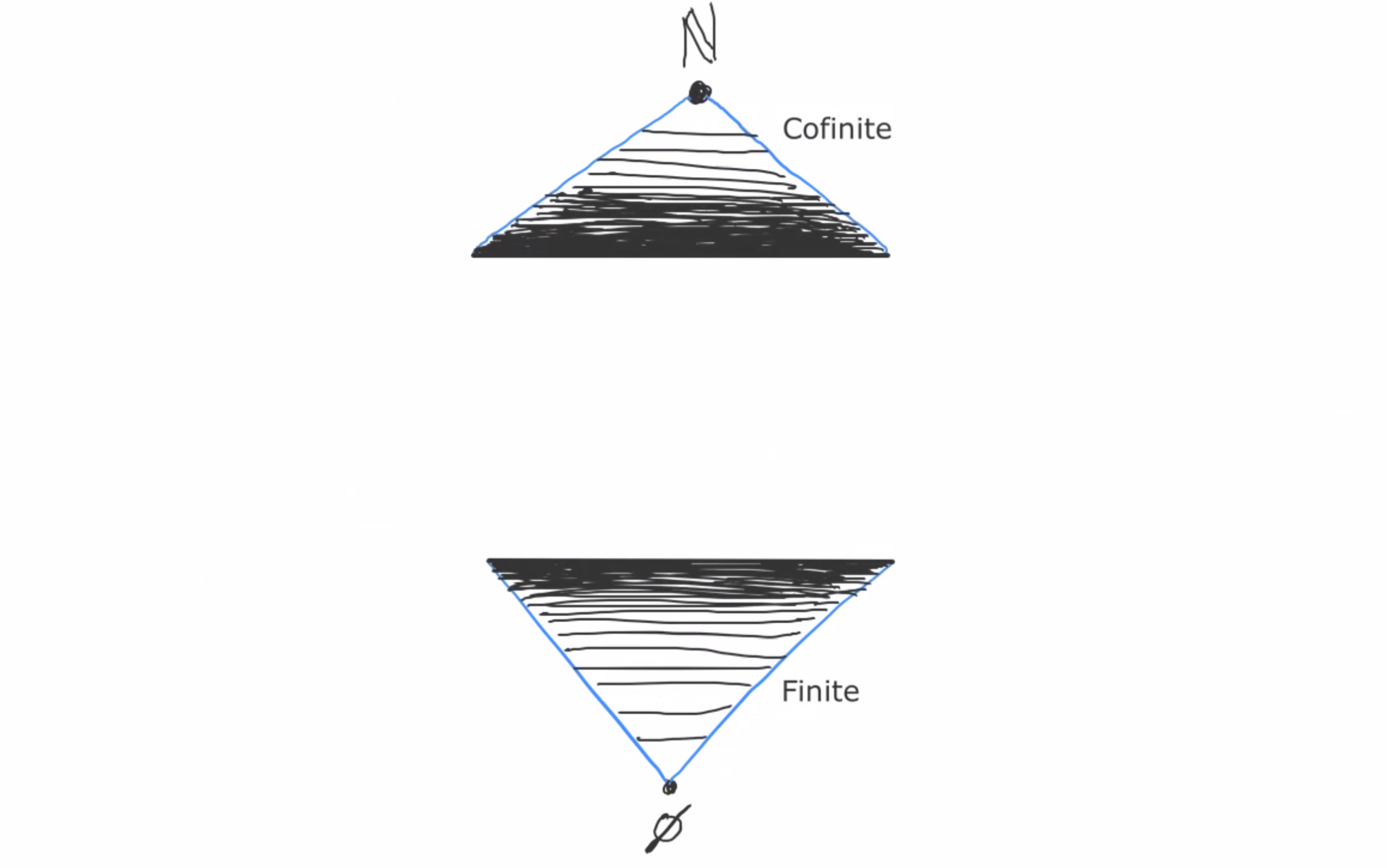 A sanity check that this diagram makes sense: start with a finite set and then add elements until you have a cofinite set. Between the finite set and the cofinite set there’s always an intermediate set that’s infinite but not cofinite. This matches with our image: any path from the finite to the cofinite passes through the middle section.
