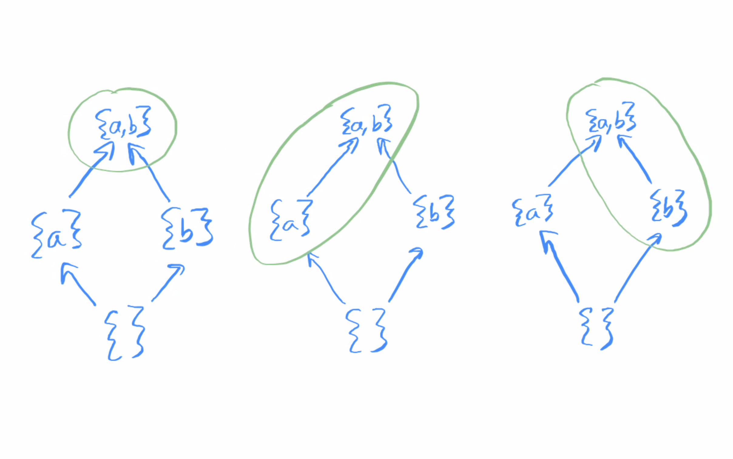 Note that we’ve left out some arrows, like the arrow from {a} to {a,b,c}. This is okay, because transitivity of the subset relation makes this arrow redundant. Anyway, what are some filters on X? Here are three of them: